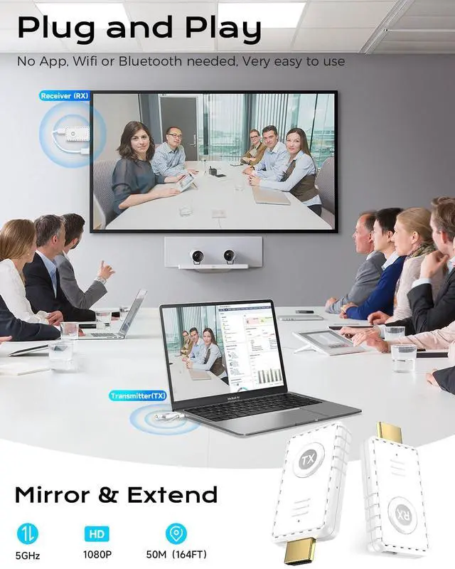 Screen RotationNote: Simply press the button on the receiver to rotate the display 90 with each press, allowing you to effortlessly switch between landscape and portrait modes for optimal viewing. ^^ Enhanced Compatibility & Audio SupportWorks with gaming consoles, smartphones (via HDMI adapter), and audio devices. Supports full audio transmission, making it ideal for Bluetooth TV transmitters, wireless audio receivers, and adapters ^^ Dual-Band Stable TransmissionUtilizing 2.4GH z/ 5.8GH z dual-band technology, this wireless HDMI extender delivers interference-resistant performance even in crowded signal environments. Perfect for conferences, classrooms, and live broadcasts ^^ Compact and PowerfulConvenience meets performance with our compact and lightweight ( 0.2 pounds) wireless HDMI transmitter and receiver. Easily pocketable, they are perfect for travel, vacations, or family gatherings. With one-touch disconnection and connection, switch effortlessly between duplicate and extended modes for seamless use. Enjoy the freedom of wireless HDMI 4K on the go ^^ Plug & Play Wireless HDMI AdapterNo WiFi, Bluetooth, or drivers needed! Simply plug in the HDMI wireless transmitter and receiver to enjoy instant screen mirroring or extended display mode. Compatible with laptops, PCs, MacBooks, TVs, projectors, and cameras ^^ Portable & Complete KitIncludes a wireless HDMI transmitter, receiver, HDMI cables, Type-C charging cables, and a user manual.
