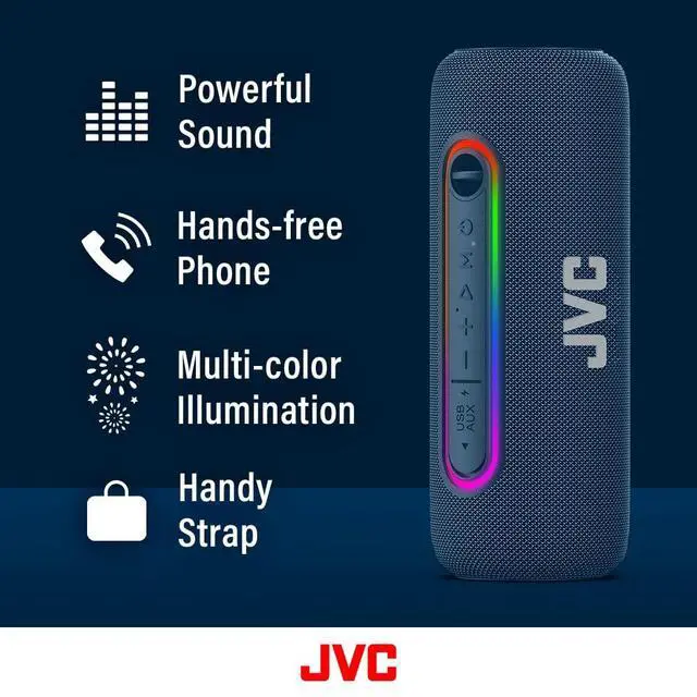 JVC Illuminated Portable Wireless Speaker with 20W max outputs, Dynamic Sound, Bluetooth 5.0, TWS Capability, USB-C, IPX5, AUX in, up to 5-Hour Battery Life - SPPA5BTA (Blue)