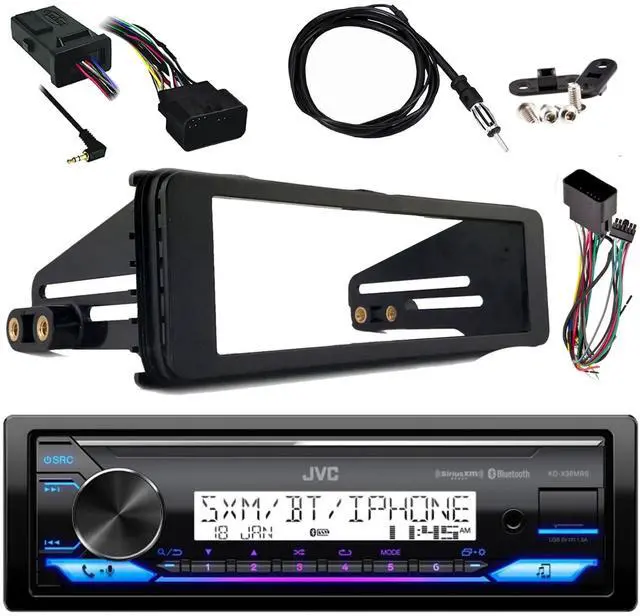 The installation accessories in this bundle are vehicle specific! Please remember to check for precise fitments/parts compatibilities with the manufacturer of the installation accessories before making your purchase. JVC KD-X38MBS Stereo Receiver AUX/USB Inputs MOSFET (22 watts RMS/50 peak x 4 channels) Backlit Display Conformal Coated PCB 13-Band EQ 2-Zone Variable-Color Illumination JVC Remote App Compatibility 4.0V High-Voltage 3 Pre-Outs Space Enhancement Sound Response Sound Lift Audio Streaming & Control iPhone Bluetooth Automatic Pairing 2-Line VA LCD Display High Current 1.5A Charging Satellite Radio Ready Wired Remote Control (Optional) Steering Wheel Remote Control Ready AM/FM Tuner 18FM, 6AM Preset Stations MP3/WMA/WAV/AAC/FLAC Playback Bluetooth Built-InMetra Stereo Install Kit ISO DIN radio provision For HD Touring 1996-2013 Designed and manufactured with precision tolerances Gapless fit between the dash and the kitHandle Bar Controls (1998-2013) Retains the factory handlebar audio controls Auto-Detect configures itself for the specific motorcycle application and aftermarket radio Comes with a plug-n-play harness in a water-resistant case Provides wires for speakers, constant power, switched power and ground Use the BC-9711 to retain rear speakers Fits HD FLH & FLT 1998-2013 (FL models with a fairing) Antenna - 40" Weather Resistant.