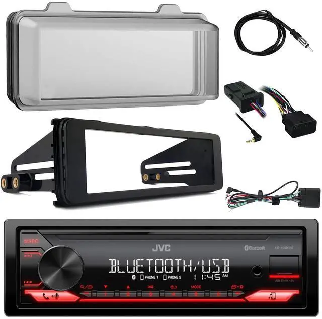 The installation accessories in this bundle are vehicle specific! Please remember to check for precise fitments/parts compatibilities with the manufacturer of the installation accessories before making your purchase. JVC KD-XD28BT Stereo Receiver 13-band equalizer with digital time alignment AM/FM tuner built-in Bluetooth for audio streaming and hands-free calling Volume Link EQ - boosts frequencies in the music that are affected by road noise. JVC Remote App Compatibility- remote optional RM-RK52 steering wheel remote control readyMetra Stereo Install Kit ISO DIN radio provision For Harley Touring 1998-2013 Designed and manufactured with precision tolerances Gapless fit between the dash and the kit