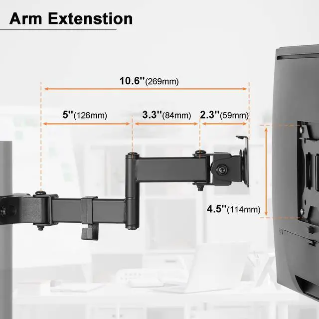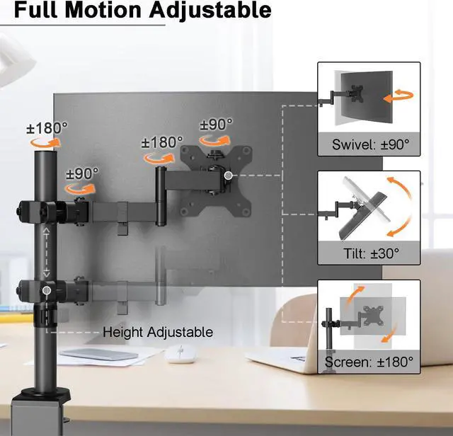 Full Motion:This VESA monitor pole mount features 2 articulating arms, allowing for more adjustment. The mounting bracket features +30deg to -30deg tilt, +90deg~-90deg swivel, +180deg~-180deg rotation and arm full extension 10.6" for comfortable viewing angles with a swiveling