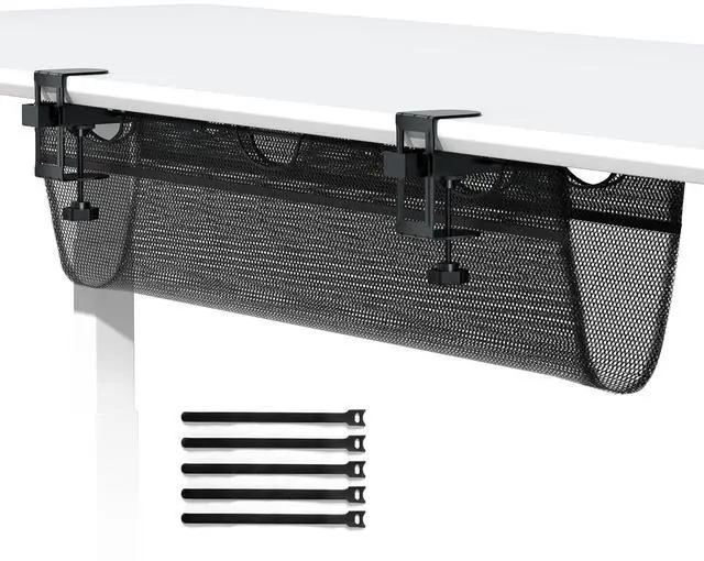 Under Desk Net: 36" W X 15.4" H Under desk mesh cable management net loops over the clamps to create an under-desk net; The netting holds up to 11 lbs in weight safely holds the wires, cables, and power strips making the work environment neat and organized; Effectively solved the common cable management problem of sitting and standing office desks