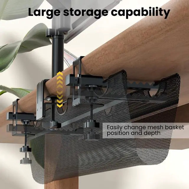 Large Storage: Sturdy C-clamps secure to your desktop with no drilling, Compatible with table surfaces 0.6 to 2.8 in thickness; The clamp has selectable slots so that you can change the mesh basket position and depth easily, with large storage capability; 5 reusable cable ties are included to secure loose cables for a more organized look