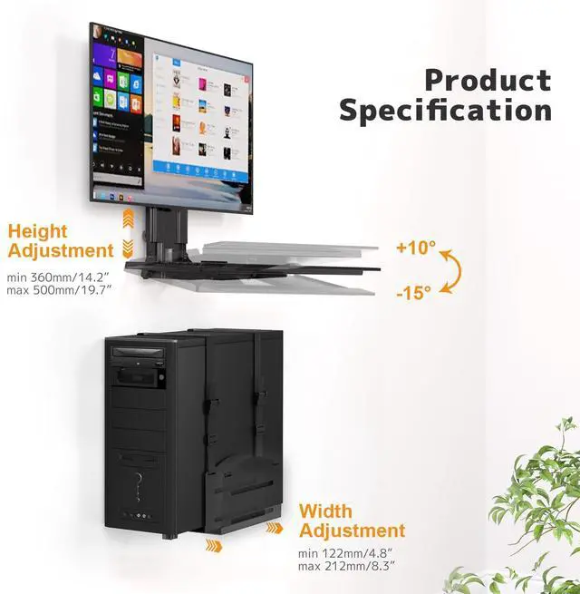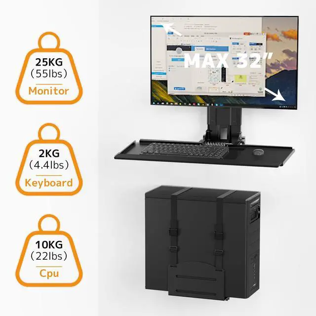 Monitor and Keyboard Wall Mount with CPU Holder for 32" Monitors (55 lbs Max), Keyboard Tray ( 4.4 lbs Load) & CPU Holder (22 lbs Capacity) - Height Adjustable, with Mouse Pad, VESA75/100
