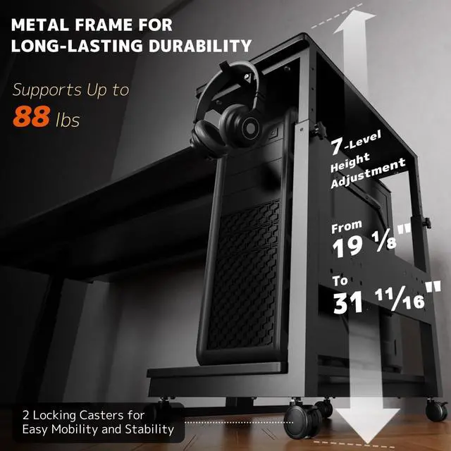 Adjustable Tower Stand: 7-level height-adjustable range from 21.7" to 33.5" fits different cpu cases, including full tower ATX case; The computer cart allows you to store computer tower under your desk or next to your table and provides enough space for ventilation to speed up heat dissipation;