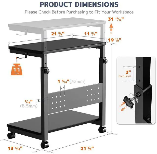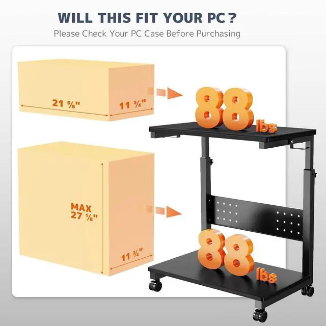 Pegboard Organize: The top shelf and pegboard baffle provide ample storage space to organize the workspace; The bottom shelf of PC cart stores the computer tower case while the top shelf holds printers, plants, documents, and magazines. Each shelf supports up to 40 kg / 88 lbs; The pegboard baffle on back organizes office supplies such as power strips, headphone etc ^^ Working AnywhereWith 4 mute rolling casters, perfect for home office to set up workplace immediately; This rolling table adjustable height also serves as a ergonomic mobile side table for resting arms and operating mouse; The computer tower stand with 2 lockable casters for fixed position, guaranteeing stability and durability; Plus, enjoy a smooth mouse operation with the included waterproof desk mat ^^
