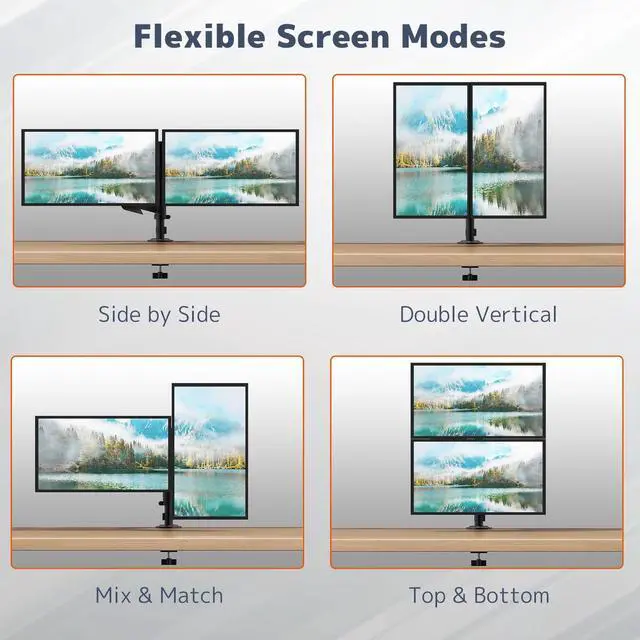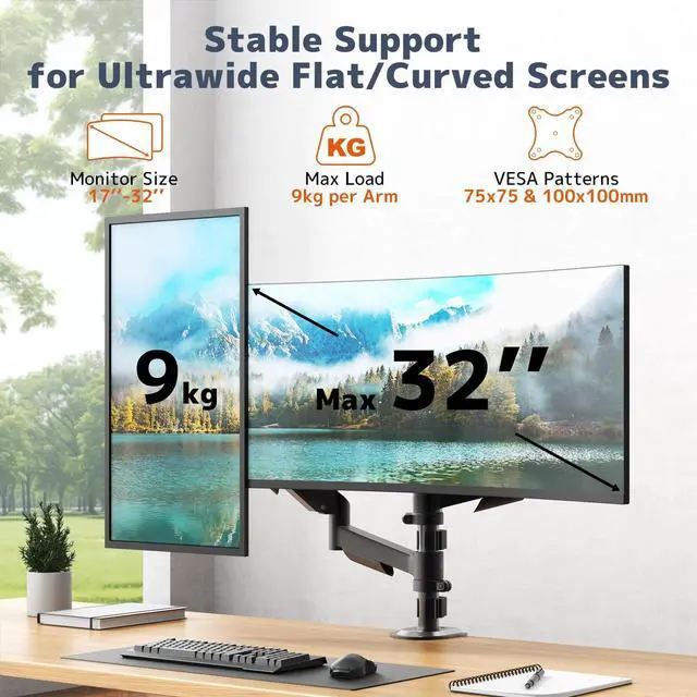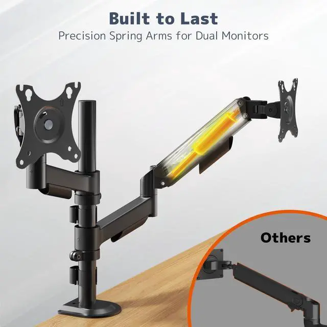 Enhanced Compatibility & Stable Support Supports two 17"32" monitors weighing 4.419. 8 lbs each. Compatible with VESA 75x75mm or 100x100mm. Mechanical spring arms provide steady and reliable positioning for most LED, LCD, or flat monitors ^^ Wider Range of Motion for Ergonomic Comfort Tilt +90/-90, swivel 90, and rotate 360perfect for vertical setups, coding, or multitasking. Adjust your screens for optimal viewing and posture, reducing neck and eye strain ^^ Mechanical Spring Advantage Built with a durable mechanical spring system for smoother height adjustments and consistent tension over timeno gas leakage risks.