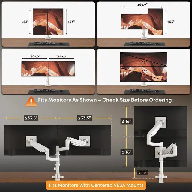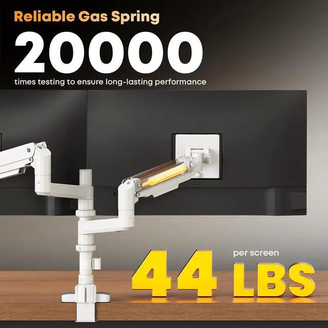 Ultra-Wide Compatibility & Heavy-Duty Support: This heavy-duty dual monitor arm effortlessly handles Max up to 2x35" screens side-by-side or stacks two massive 49" monitors vertically. It holds up to 44 lbs per screen with stable support, fitting standard 7575mm and 100100mm VESA mounting patterns ^^ Ergonomic