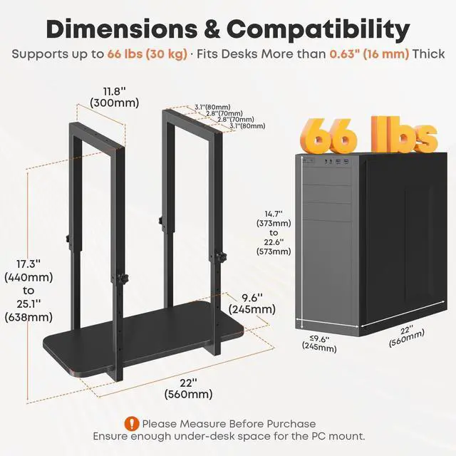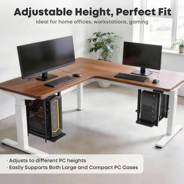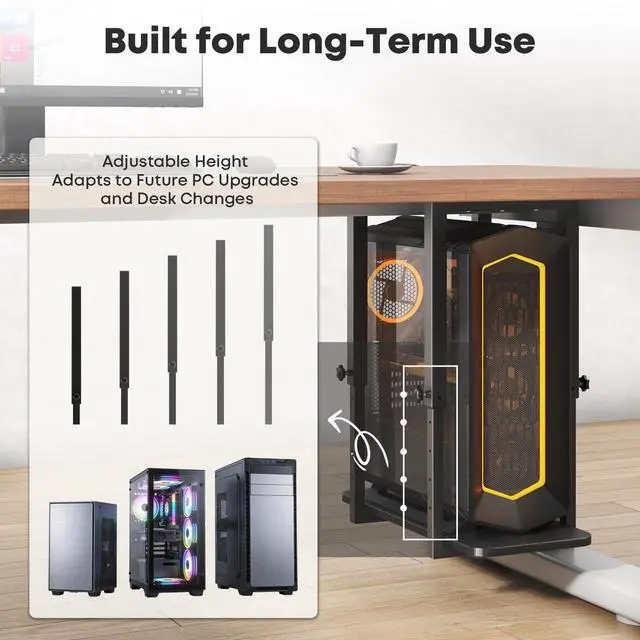 Capacity: Built with a reinforced steel frame and a stable rectangular wood base, this under-desk PC holder supports up to 66 lbs (30 kg) without tilting or sagging, keeping your computer firmly in place ^^ Adjustable Height for
