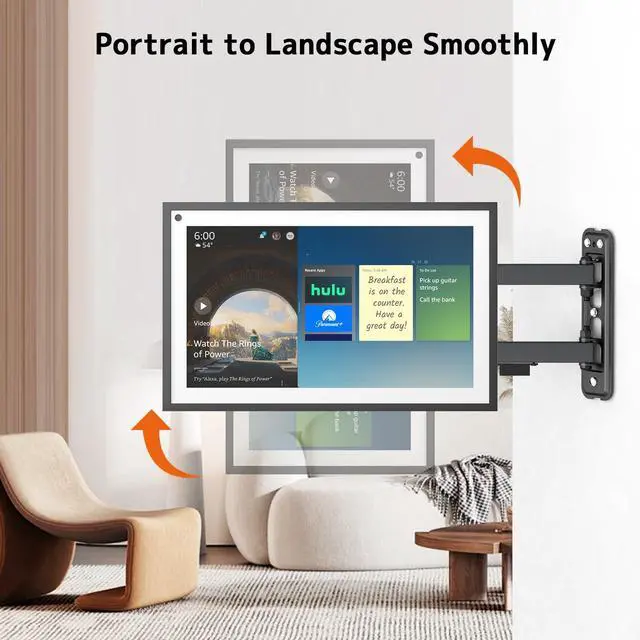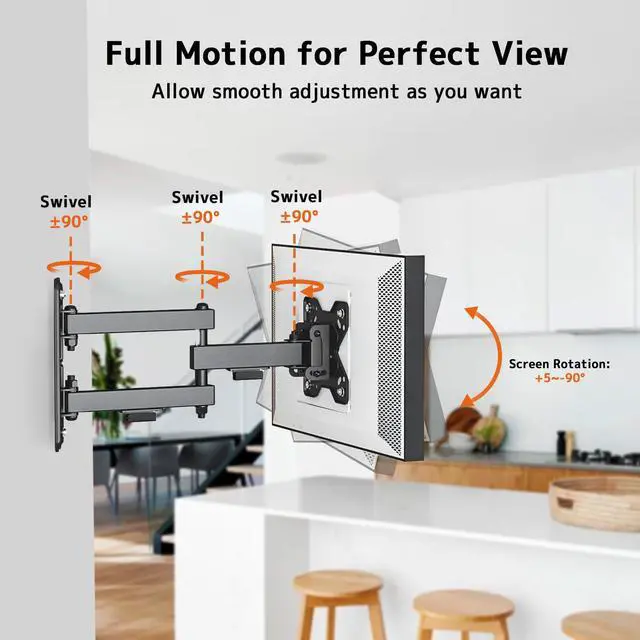 ADJUSTABLE ARM: Wall mount features +5/-15 tilt, +5/-90 rotation and +90~-90 swivel for better viewing angle. It can be flexibly and smoothly switched from portrait to landscape. Easily to get the optimal viewing angles when using your devices ^^