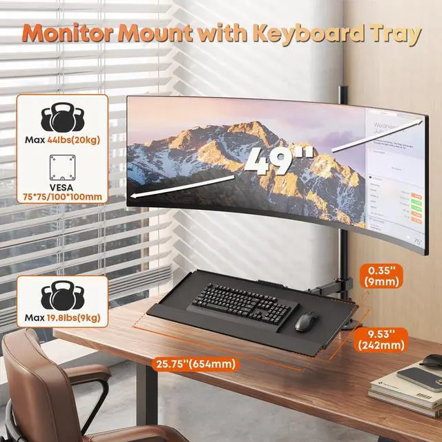 ^^ Wide Compatibility: This monitor and keyboard mount supports monitor up to 49 inch and 44 lbs. The keyboard mount ( 25.75"L x 9.53"W ) holds up to 19.8 lbs and is also compatible with an optional laptop mount, giving you flexible setup options.