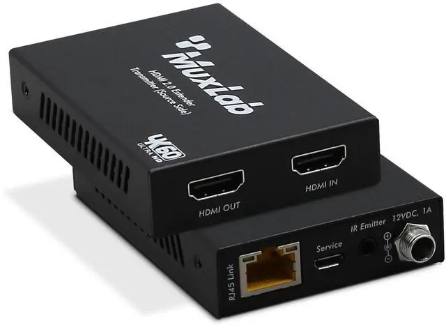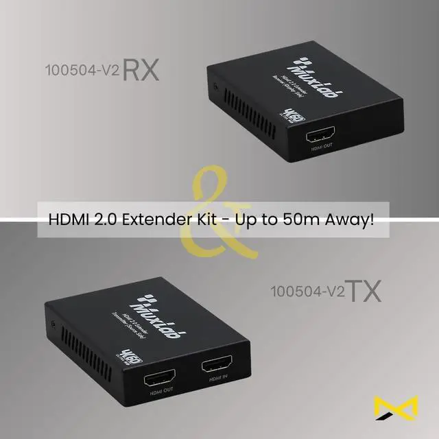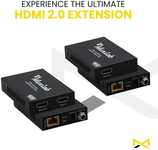 Enhance your AV setup with the Muxlab HDMI 2.0 Extender Kit, designed to deliver ultra-clear 4K/60Hz video, audio, and one-way IR signals up to 164ft (50m) over a single Cat5e/6 cable. Perfect for both commercial and residential use, this extender features an HDMI loop-out, HDCP 2.2 compliance, and PoC (Power over Cable) for simplified setup. Ideal for applications ranging from digital signage and boardrooms to collaborative PC systems, this kit includes a transmitter and receiver, enabling seamless signal extension without signal degradation.