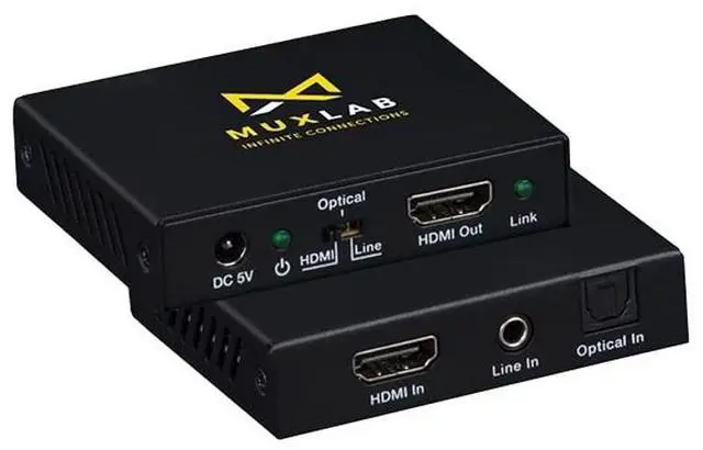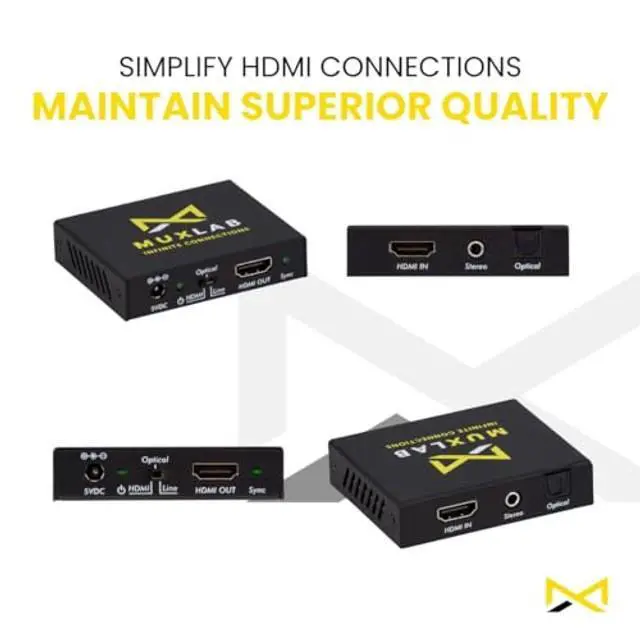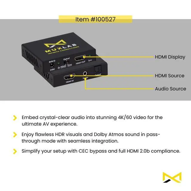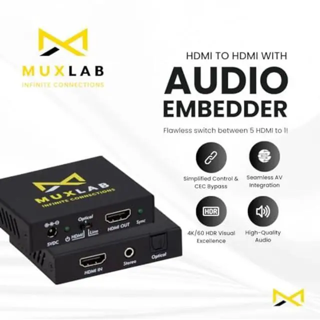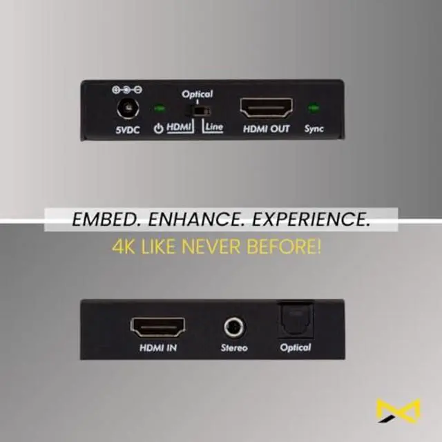 The HDMI to HDMI with Audio Embedder, 4K/60 allows embed audio signals from digital optical or analog stereo Line audio to HDMI output. Further, both input and output HDMI support video resolution up to 4K/60Hz ( 4:4: 4). The device supports 10bits HDR (High Dynamic Range) pass through and HDMI high resolution digital audio formats bypass, LPCM 2CH, Dolby TrueHD, Dolby Digital Plus, Dolby Atmos and DTS-HD Master Audio. The unit is HDCP 2.2 compliant and supports CEC bypass.