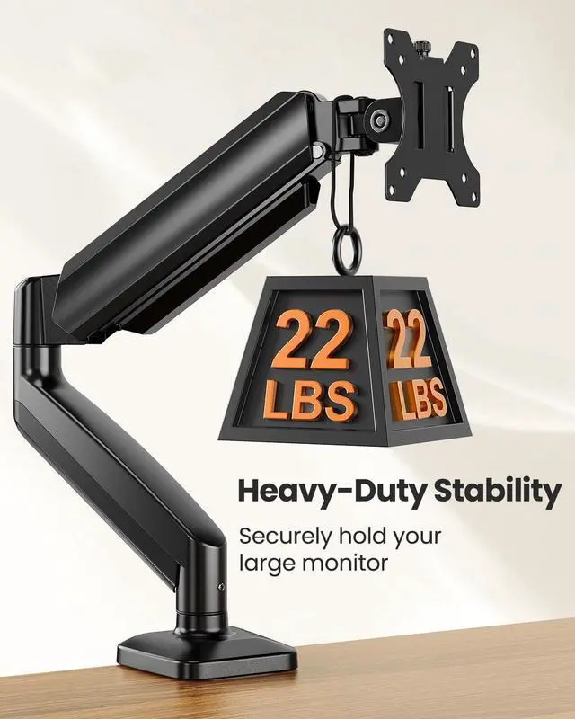 Monitors: This heavy-duty monitor arm is crafted from aviation-grade aluminum alloy, providing supperior support for screens up to 49 (22 lbs) and supporting VESA patterns of 75x75mm and 100x100mm. It offers 3x stronger support than standard arms, eliminating sagging and wobble. It's the ultimate solution for curved and flat monitors, upgrading the setup of your gaming room or ultrawide workstation. ^^ Ergonomic Comfort & Full Motion Adjustability: This monitor arm offers up to 16.54 height adjustment and 16.81 extension for optimal eye-level comfort, reducing neck strain. It also provides +90/-35 tilt, 90 swivel for flexible viewing angle, and 360 rotation for versatile viewingeasily switch between drafting documents in portrait mode and watching movies in landscape mode.