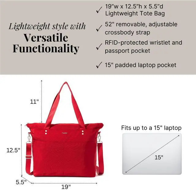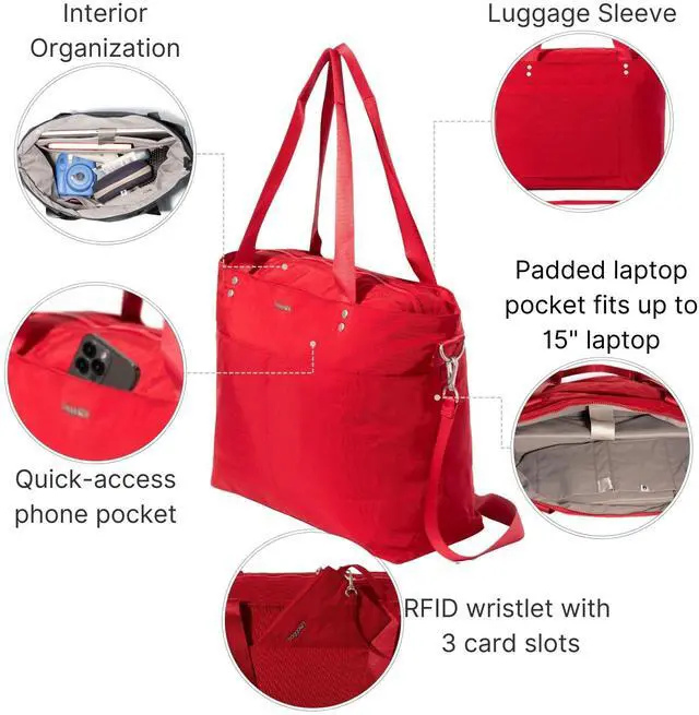 With the ability to be worn as a shoulder bag or crossbody bag, this spacious tote bag is a must-have for your work week, upcoming travels, weekend or day trips. Store your laptop computer in the secure 15 laptop sleeve. For smaller items that require fast access, exterior slip pockets and an RFID wallet wristlet have you covered. Stack the Carryall Laptop Tote on your wheeled luggage for a seamless travel experience. This purse offers plenty of room for your travel essentials, cruise essentials, beach essentials, camping essentials and everyday essentials.
