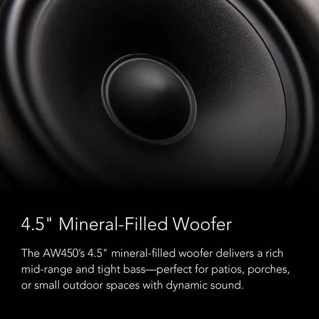Definitive Technology Dymension Outdoor AW-450 Speakers For Small Cozy SpacesTake your outdoor entertainment to the next level with the Dymension AW-450 Speakers by Definitive Technology featuring (1) 4.5" mineral-filled woofer, (1) 1" dome tweeter, and (1) 4.5" x6" dual-suspension passive bass radiator for lifelike, immersive audio. Whether you're relaxing in your garden or in your small balcony, the AW-450 delivers premium sound quality with advanced acoustic technologies in small outdoor spaces. Designed to withstand the elements, the AW-450 features a rugged, mineral-filled enclosure that is IP66-rated for ultimate durability. This weather-resistant design ensures the speakers perform flawlessly in any conditions.