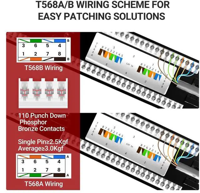 • Cat5e 24 port patch panel for 100/1000 Mbps networking, accept 23-26 AWG Cat5e/Cat5 solid and stranded UTP cables