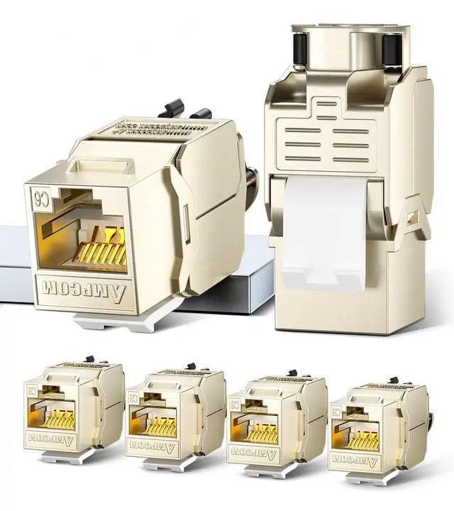 8P8C connector with shielding for a 1 GBASE-T channel compliant network and a max signal transfer of 250 MHz, Nickel-plated solid zinc casing and copper foil tape to suppress EMI and NEXT electromagnetic noise and crosstalk and 50 gold plated contacts with dust cover to prevent oxidization for reliable and stable connections