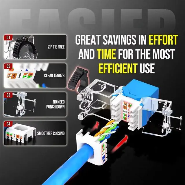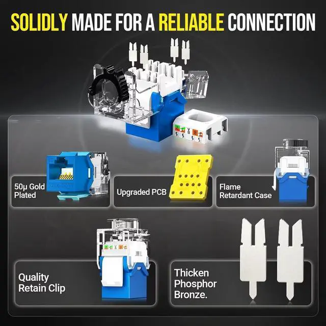 The AMPCOM CAT6A RJ45 UTP Ethernet Keystone Jack is a professional-grade networking solution designed for easy and efficient installation, featuring an innovative tool-less design ^^ Environmental DesignFeaturing a tool-less termination and a new design with a zip tie-free adjustable ratchet lock mechanism, offers easy and efficient installation. It can be reusable and well-constructed build, made from durable plastics, ensures long-lasting durability ^^ Well-terminated Contacts50u gold plated contacts enhance conductivity, prevent oxidation, and ensure a secure and reliable connection by aligning straight with the RJ45 port pins for a snug and firm fit ^^ Signal Transmission QualityReliably support speeds of 10 Gbps with a maximum bandwidth of 500 MHz, maintaining the integrity of Ethernet signals for reliable and efficient network performance ^^ Compliance with StandardsMeets the TIA/EIA-568-A/TIA/EIA-568-B Standard, as well as meeting signal-to-noise ratio and crosstalk performance specifications, RoHS compliant, and PoE/PoE+ (Power over Ethernet) supported