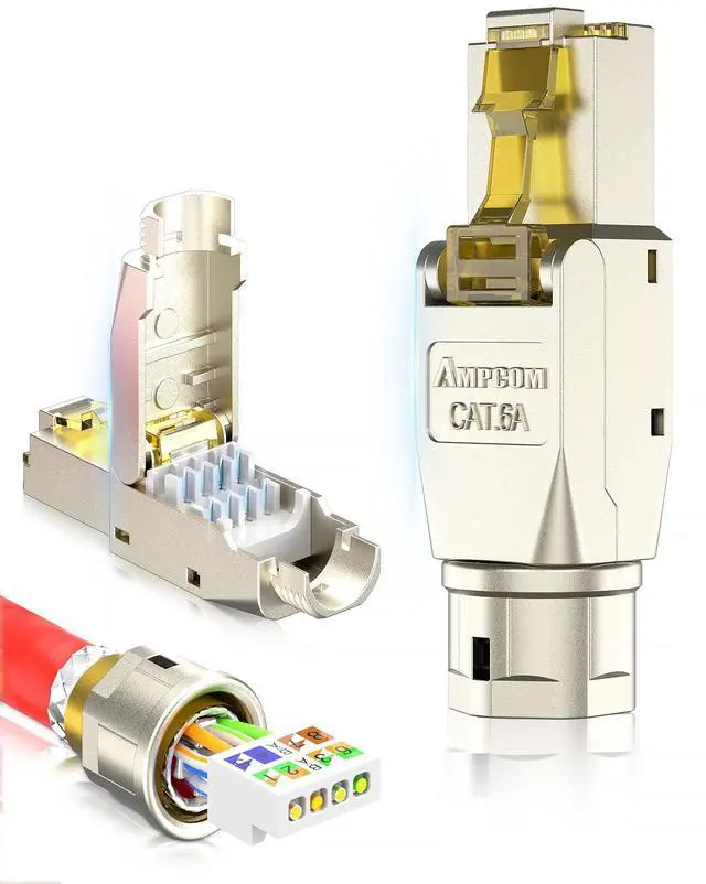 AMPCOM STP RJ45 Connector CAT6A Tool-Free Ethernet Field Termination plugs ^^ The robust metal foreign trade of zinc alloy provides excellent shielding and the solid wire allows for better heat dissipation ^^ Ethernet field terminal for easier installation without crimping tools, also available for T568A or T568B cabling ^^ POE+ and POE++ compliant, supporting shielded 22AWG to 24AWG Ethernet cables with diameters greater than 7 to 8.5 mm ^^