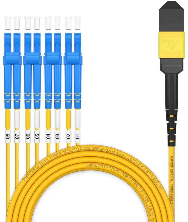 AMPCOM MPO to LC Breakout Cable 9/125m Singlemode OS1/OS2(8 Fiber, MPO to LC, Type B, LSZH/Riser, UPC, Yellow) 10m (32ft)
