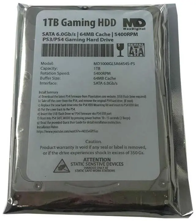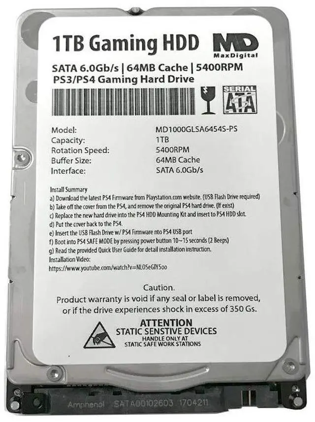 MaxDigitalData (MD1000GLSA6454-PS) 1TB 64MB Cache 5400RPM SATA 6.0G b/s 2.5 inch 7MM Gaming Hard Drive (For PS3/PS4) - 2 Year WarrantyFerocious performance. Superior storage. Tireless durability. Gamers, creative professionals and tech enthusiasts get improved boot times, application loads and overall system responsivenesswithout sacrificing capacity or resources. 2.5 -inch PC compute and gaming hard drive with a thin 7mm z-heightMassive 1TB capacity can store up to 80 25GB games. Adaptive Memory technology efficiently identifies frequently accessed data to allow for quicker operationsBacked by a 2-year limited warrantyMaxDigital Hard drives are the perfect upgrade for gamers, creative professionals and PC enthusiasts.