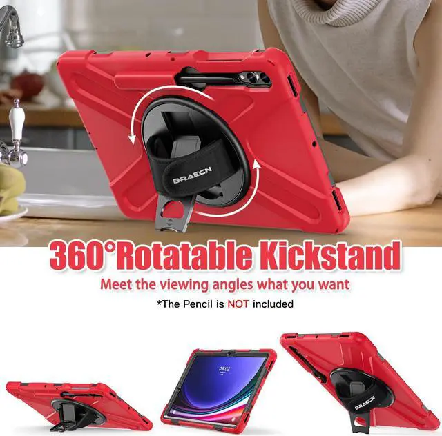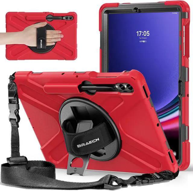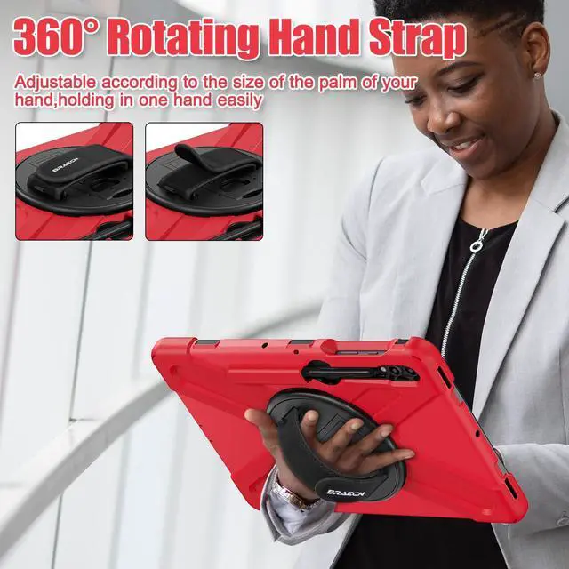 BRAECNstock for Samsung Galaxy Tab S10+ Plus/ S9 FE+ Plus/ S9+ Plus/ S8+ Plus/ S7 FE/ S7+ Plus 5G Tablet Case 12.4 inch Shockproof Protective Kids Cover with Pen Holder Rotating Stand+Hand Strap - Red