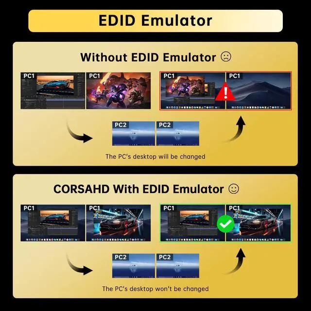 Simulation EDID Lock Screen: This USB3.0 HDMI KVM switch can simulate the EDID of the display, store the resolution and refresh rate of the display, and when the monitor is switched between two computers, the original window order will not change, so that the computers and the monitor are connected normally.