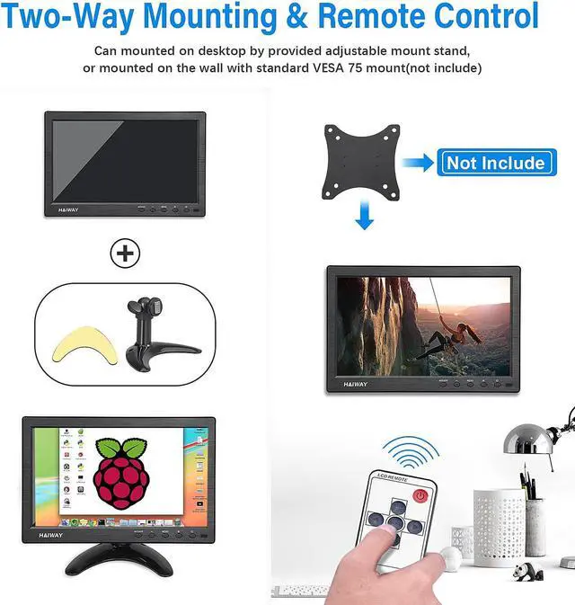 Haiway 10.1 inch Security Monitor, 1024x600 Resolution Small HDMI Monitor Small Portable Monitor with Remote Control with Built-in Dual Speakers HDMI VGA BNC Input for Gaming CCTV Raspberry Pi PC