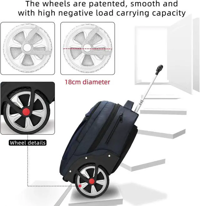 [Large Wheel, Climbing Hotel Stairs Very Easy, No Wear Off The Backpack] This wheel, which we have registered an American patent, is unique. Rolling Backpack Have 18CM(7inch) Wider large Wheel, steady, heavy loading, saving labour and time, easy thru airplane aisles and stair, do not worry the wheels turned sideways, also do not worry wear off the backpack