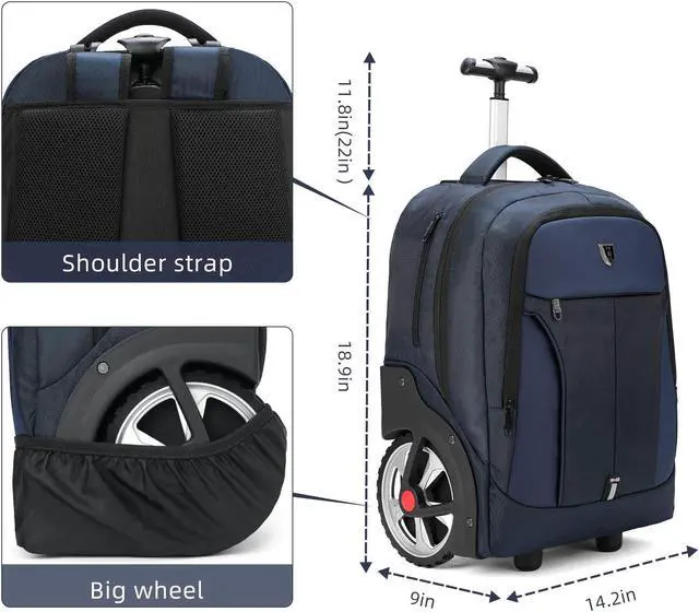 [Large Capacity Space] Large rolling backpack size is 21.6 x 14.1 x 10.2 inches(55*36*26cm).The Padded laptop compartment with Velcro sleeve -16 x 10.2 x 1.2 Inches holds up to 17 inch laptop, as w