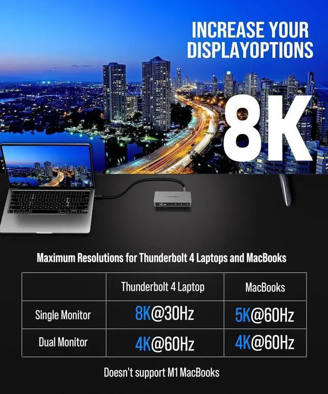 Media Display: The Thunderbolt 4 downstream port supports media display to a single monitor in up to 8K@30Hz, or to dual monitors in up to 4K@60Hz. (M1 CHIP DOES NOT SUPPORT DUAL MONITOR)