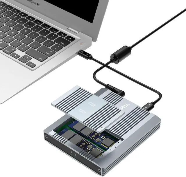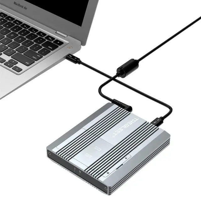 Supports Two NVMe Drives and aluminum enclosure featuring two Thunderbolt 3 portsup to 2800MB/s of mind-bending performance via Thunderbolt 3, Thunderbolt 4. ^^ High speed transfer. Each SSD transfer speed at about 1500 Mbps ( and able to reach 2800 Mbps when it's in RAID 0 setup ) ^^ Support software RAID0 and Raid1 ^^ Support computers with Thunderbolt 2 interfaceNeed Thunderbolt 3 to Thunderbolt 2 Adapter ^^ Support power delivery port supporting up to 60W