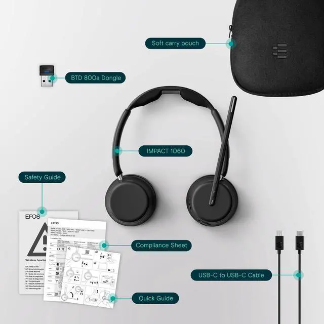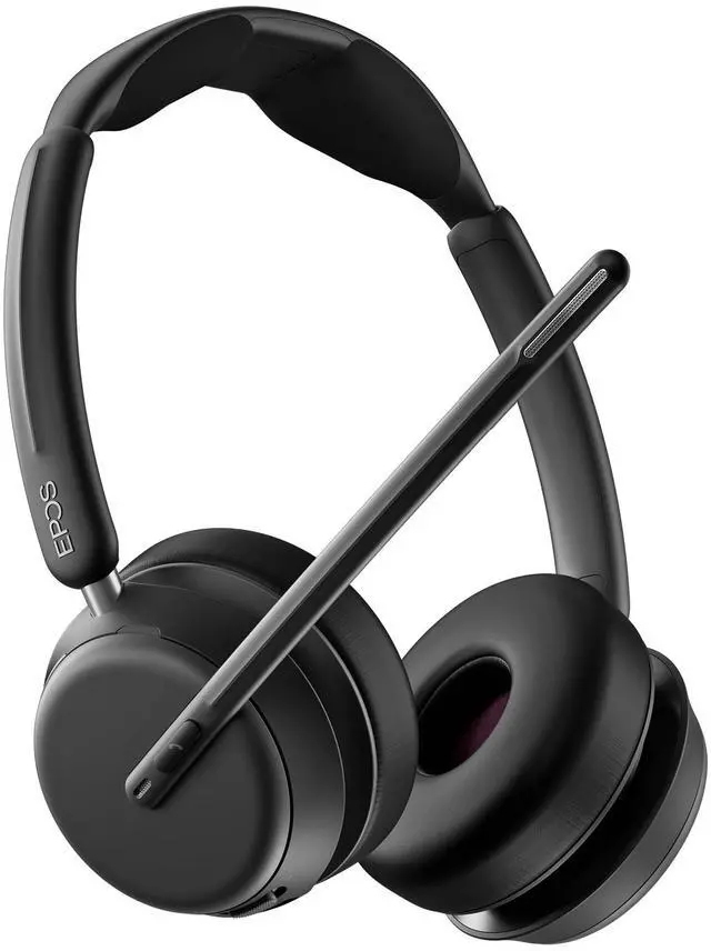 The EPOS IMPACT 1060 is a premium wireless headset with mic, designed for professionals in open offices, remote work, and hybrid environments. Featuring EPOS AI adaptive microphones, it delivers industry-leading voice pickup, eliminating background noise for crystal-clear calls on Microsoft Teams, Zoom, and Skype. Experience super wideband audio for natural speech clarity, making conversations sound more lifelike. Whether you're in business meetings, customer service, or virtual calls, this Bluetooth headset for work provides exceptional sound quality. Built for comfort, the lightweight design, breathable ear cushions, and padded headband ensure all-day wearability, making it an ideal PC headset for work, office headset, or call center headset.