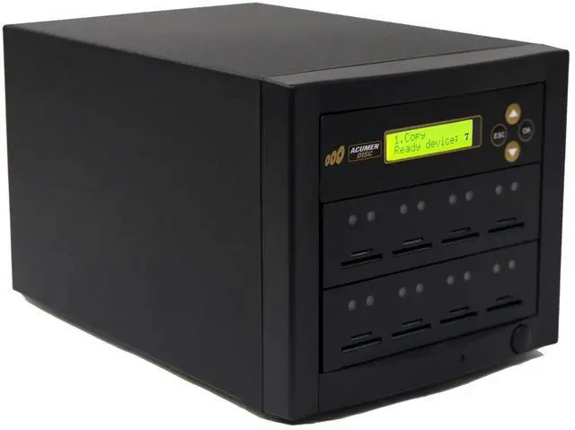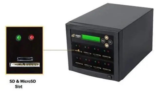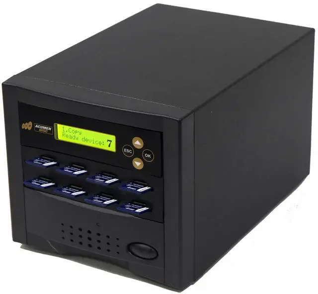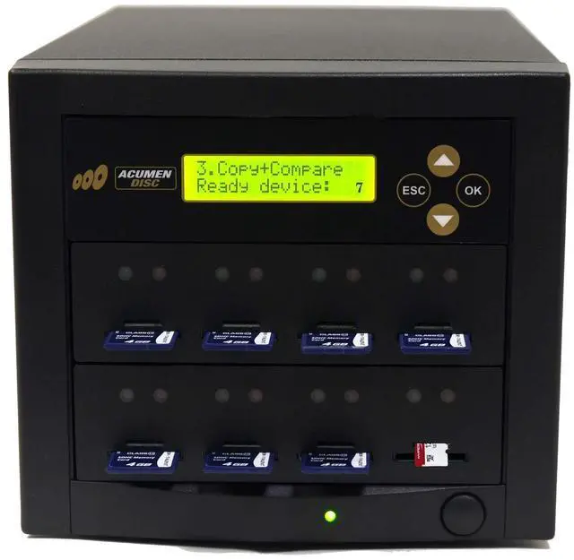 Acumen Disc Micro SD / SD Secure Digital Flash memory card duplication system provides you a convenient way to copy the two most popular digital media format MicroSD / SD card. Don't forget about DoD compliant erase function! as this erase mode permanently deletes sensitive data. Total Standalone unit. No software needed. The system have two separate slots for MicroSD and SD cards**, so you don't have to worry about adapters. **Only one slot of the 2 slot combo works at a time. Source Analysis feature identifies the content on the master and intelligently copies only the data to speed up copy cycle.