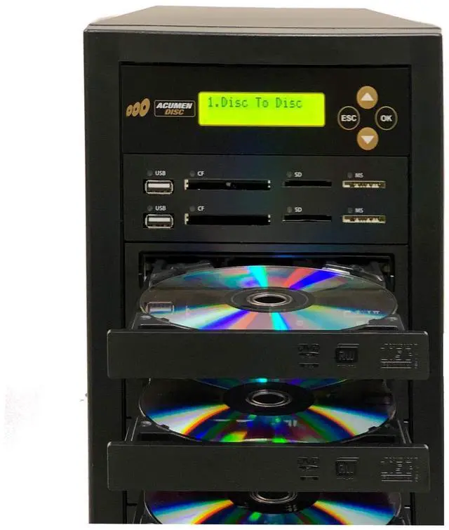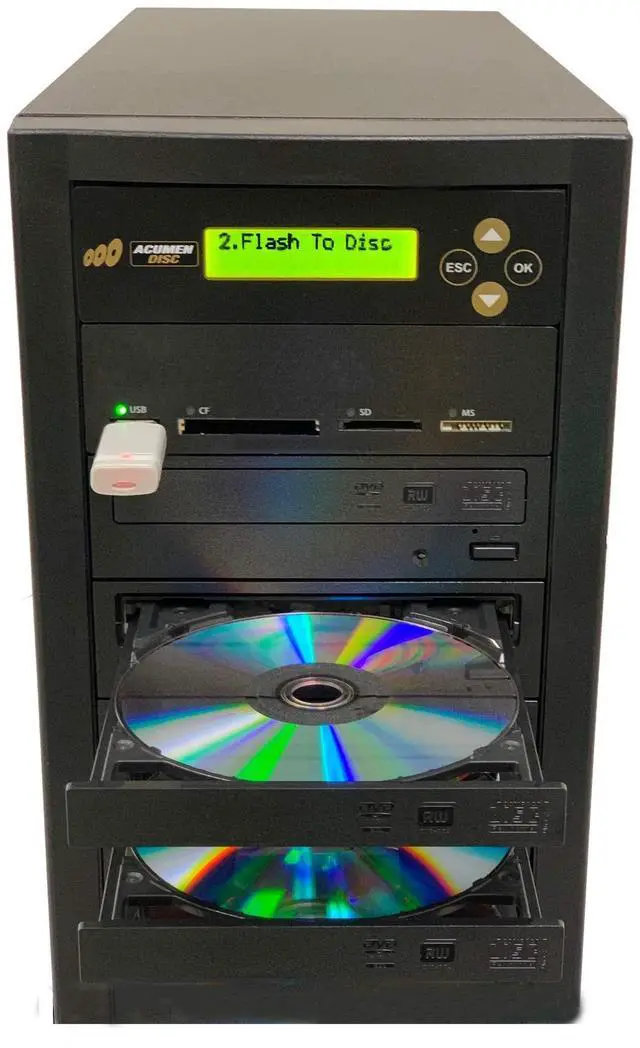 . copy any of the flash media in the unique deck of 4 different flash media memory to the same or different type of flash media in this unique one of a kind duplicator in the market. Besides being a disc to disc duplicator, you can use this complete system as an single target media duplicator to copy one USB, CF, SD or MS to the same or other type of media in the lower slot. There are 4 reader on the media deck that can be copy to the lower slot for this one to one copy media duplication (CompactFlash, Secure Digital, Memory Stick or USB at one at a time single target copy).