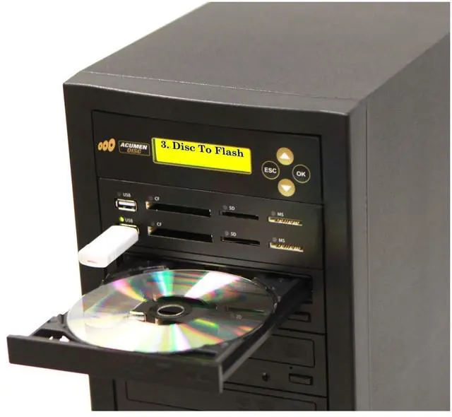 Product Copy Features: 1 Flash Memory to Flash Memory Copy (Any 1 type of flash memory in reader to Any 1 Type of Flash Memory in writer) 1 Flash Memory (Any 1 Type of Flash Memory in reader) to 1 Disc Copy 1 Disc to Flash Memory (Any 1 Type of Flash Memory in writer) Copy Single Targets Disc to Disc CopyThis unique crossover media copier is great for that one quick back-up copy you have been looking for. This is a true all-in-one, stand alone solution for data backup and disc duplication. No hard drive required. Please note in that our duplicator cannot copy discs from store bought or rental video with copy protections.