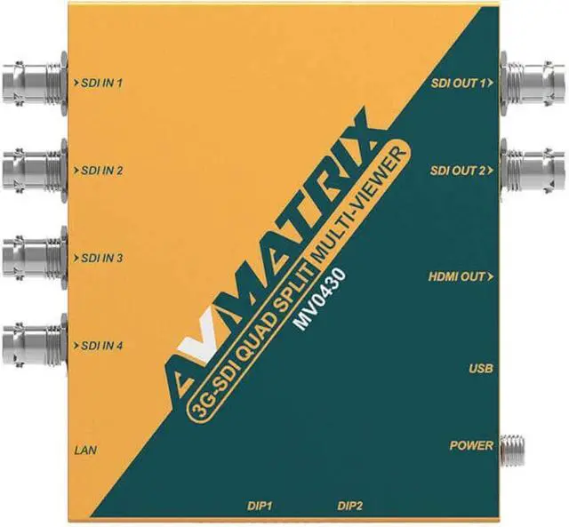 Model: MV04303G-SDI Quad Spilt MultiviewerMV0430 is an exquisite and professional device with multi-functions: 3G-SDI full screen/2/3/4 Split Multi-viewer with SDI & HDMI output, 3G-SDI to HDMI signal converter, 12 SDI distribution amplifier with SDI & HDMI output, and 4x1 3G-SDI switcher with SDI & HDMI output. The SDI and HDMI output format can realize up/down scaling and frame rate conversion. All the functions can be easily set by built-in DIP switches, USB keyboard or PC via LAN. MV0430 is your ideal choice for broadcasting and AV post production applications. 4SD/HD/3G-SDI inputs with auto detection2SD/HD/3G-SDI and 1HDMI outputs for multi-view 11 selectable SDI & HDMI output formatsUp/down scaling and frame rate conversion16 preset layouts, Support both full-screen and multi-view mode11 character UMD overlay, support custom position and colorAudio level meter overlay, support custom positionControl easily via the DIP switchesUSB port for keyboard controlLAN port for control and firmware updateThreaded locking power connectorDetachable bracket design for wall mounting11 Output Formats SelectableThe MV0430 features in 4-channel 3G/HD/SD auto adaptive inputs and 2-channel 3G-SDI as well as 1-channel HDMI outputs. Four inputs can be showed simultaneously on the same display. From 720p25 to 1080p60, 11 signal output formats are supported for user's choices.