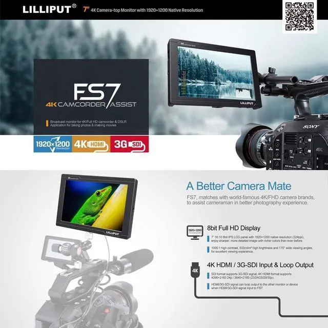 The Lilliput FS7 monitor is a 7" widescreen monitor with 4K HDMI 1.4 input with loop through, and SDI input/output loop through. Housed in a solid metal frame, and with a plethora of additional framing features/options, it gives you superior control over your workflow whether in the field or in the studio. 4K HDMI & 3G-SDI Input & Loop Through The Lilliput FS7 Features both 4K inputs at 4096 x 2160p @24p and 3840 x 2160p @ 23, 24, 25, 29, and 30Hz. The SDI input and standard HDMI input operate at up to 1920 x 1080p @60Hz frequencies, making for a wide variation of input specs.