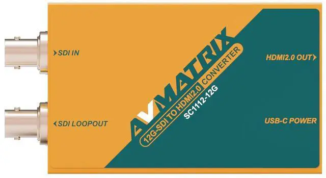 SC1221-12G HDMI 2.0 TO 12G-SDI 4K BROADCAST CONVERTER 4K HDMI to 12G-SDI Convert & Split 4K HDMI Loop-out Up to 4K60 resolution USB Type-C Power Video & power signal LED indicators Equipped with detachable bracket ^^ SC1112-12G 12G-SDI TO HDMI 2.0 4K BROADCAST CONVERTER 12G-SDI TO HDMI 2.0 12G-SDI Loop-out Up to 4K60 resolution USB Type-C Power SDl with Equalization and Re-clock Video & power signal LED indicators Equipped with detachable bracket
