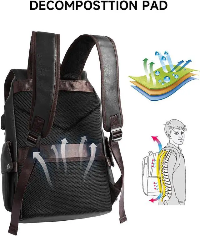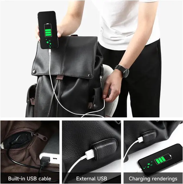 LAPTOP SCHOOL BACKPACK FOR MEN WOMEN : Waterproof and high quality soft PU Black Leather , USB charging , Fit 15.6" Laptop , Smooth Zipper. Excellent stitching technic makes the mens womens black leather backpack more strong and sturdy