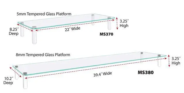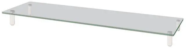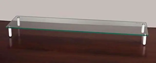 Elegant minimalist design. Extra-wide monitor riser holds two monitors. Ample space to place accessories and store keyboard underneath. Strong tempered glass platform. Sleek designer-look white legs with non-skid feet.