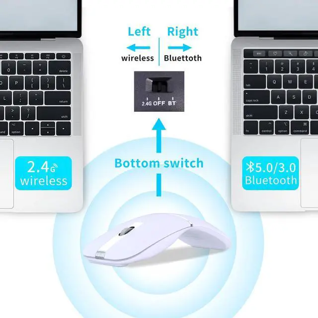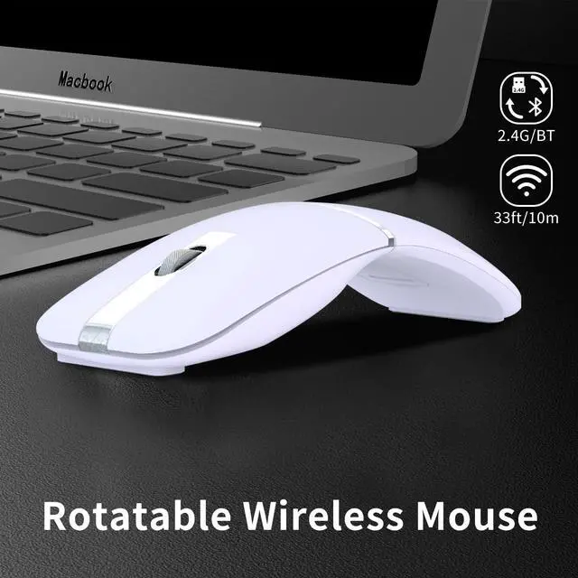 [( Dual Connection Model )] This rotating wireless mouse has a dual mode connection. Bluetooth 5.0 brings fast response, accurate movement, stable connectivity, and smoother tracking. Bluetooth/2.4GHz wireless mouse can work on two devices. Connect one device through Bluetooth and another device through a 2.4GHz USB receiver. Simply switch between two devices. With just one mouse, you can freely switch and control two devices.