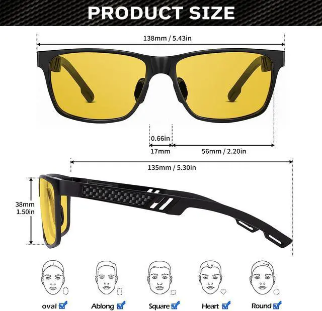 High Quality Mg-Al Metal Frame - These polarised night vision glasses are made of lightweight and durable Mg-Al frames, which are lighter and more flexible than ordinary material frames, ensuring comfort for long time wearing. Featuring high-definition polarised lenses with anti-glare, they are suitable for night driving, as well as for many outdoor sports such as cycling, running, fishing