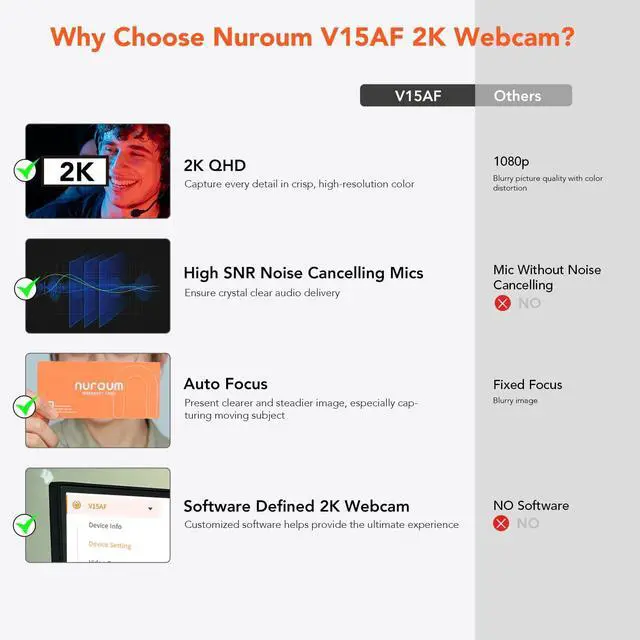 [(Faster and More Precise Autofocus)] Nuroum V15AF webcam has an autofocus feature, so nearby objects or persons remain crisp and in focus. This technology can distinguish people from walls and windows and apply the necessary optimization and focus. If you want to present something, the function is extremely useful because the camera will automatically focus on the objects if they are held close to the lens.