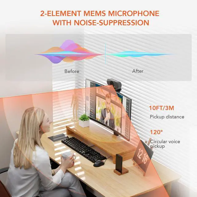 [(2 Built-in Noise Cancelling Microphones)] Dual-mic webcam with two microphones on both sides of the lens, providing a more natural-sounding HD stereo a