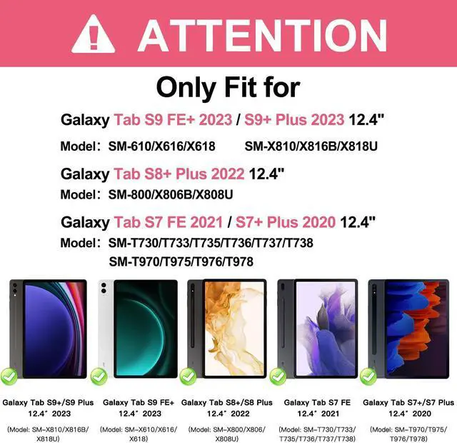[Compatibility] ONLY designed for Galaxy Tab S10 Plus 12.4" inch 2024 ((Model: SM-X820/ X826B/ X828U)); Galaxy Tab S9 FE+ Plus 12.4" inch 2023 (Model: SM-X610 /X616 /X618); Galaxy Tab S9 Plus 12.4" inch 2023 (Model: SM-X810 /X816B /X818U); Galaxy Tab S8 Plus 12.4" inch 2022 (Model: SM-X800 /X806 /X808U); Galaxy Tab S7 FE 5G 12.4" inch 2021 (Model: SM-T730 /T733 /T735 /T736 /T738); Galaxy Tab S7 Plus 12.4" inch 2020 (Model: SM-T970 /T970 /T975/ T976/ T978)