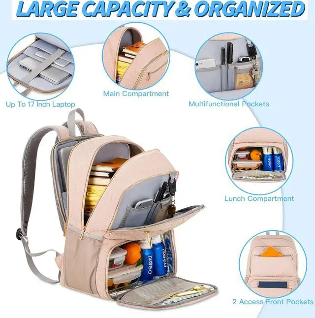 [(MULTIPLE POCKETS & LARGE CAPACITY)] Backpack lunch bag for women provides versatile storage space, including a computer compartment that can accommodate laptops up to 17 inches, a main storage compartment for clothes, books, and a multifunctional pocket with a key ring, convenient for storing and retrieving keys. In addition to the 4 main compartments, there are 14 inner and side pockets for organizing and storing items. It is a practical lunch bag backpack that can meet your daily needs.