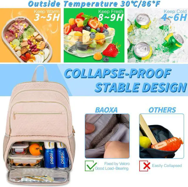 [(UPGRADED 2-IN-1 DESIGN)] The backpack with lunch box combines a laptop compartment and a lunch bag, so you don't need to carry an extra lunch bag. The backpack with cooler compartment has a thermal insulation function, which can keep food warm and fresh, and also keep cold drinks cool. To improve the stability of the lunch bag, we have added an upgraded design of anti-collapse Velcro on both sides of the lunch bag, ensuring that your lunch will not be flattened or overflowed.