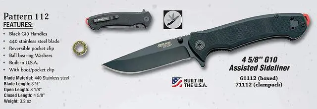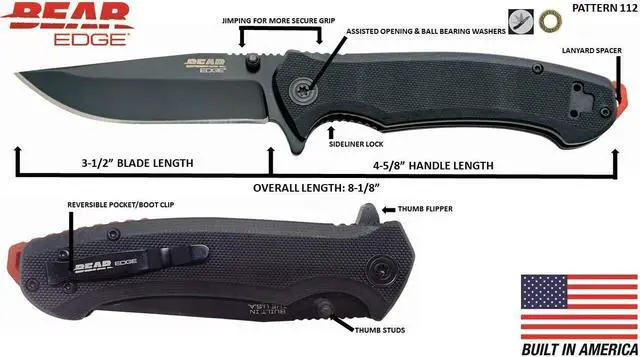 Assisted opening. 4.63" closed. 3.5" black finish stainless drop point blade. Black G10 handle. Extended tang. Thumb stud. Lanyard hole. Pocket clip. Boxed.